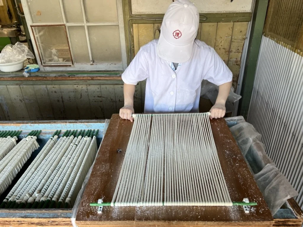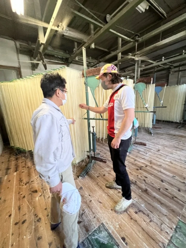 そして長尾製麺へ。麺作りの工程やカスタマイズされたクラシックな機械、パッケージデザインまで、専務の長尾洋介さんのクリエイティビティが詰まったアートプロジェクトのような製麺工場です。